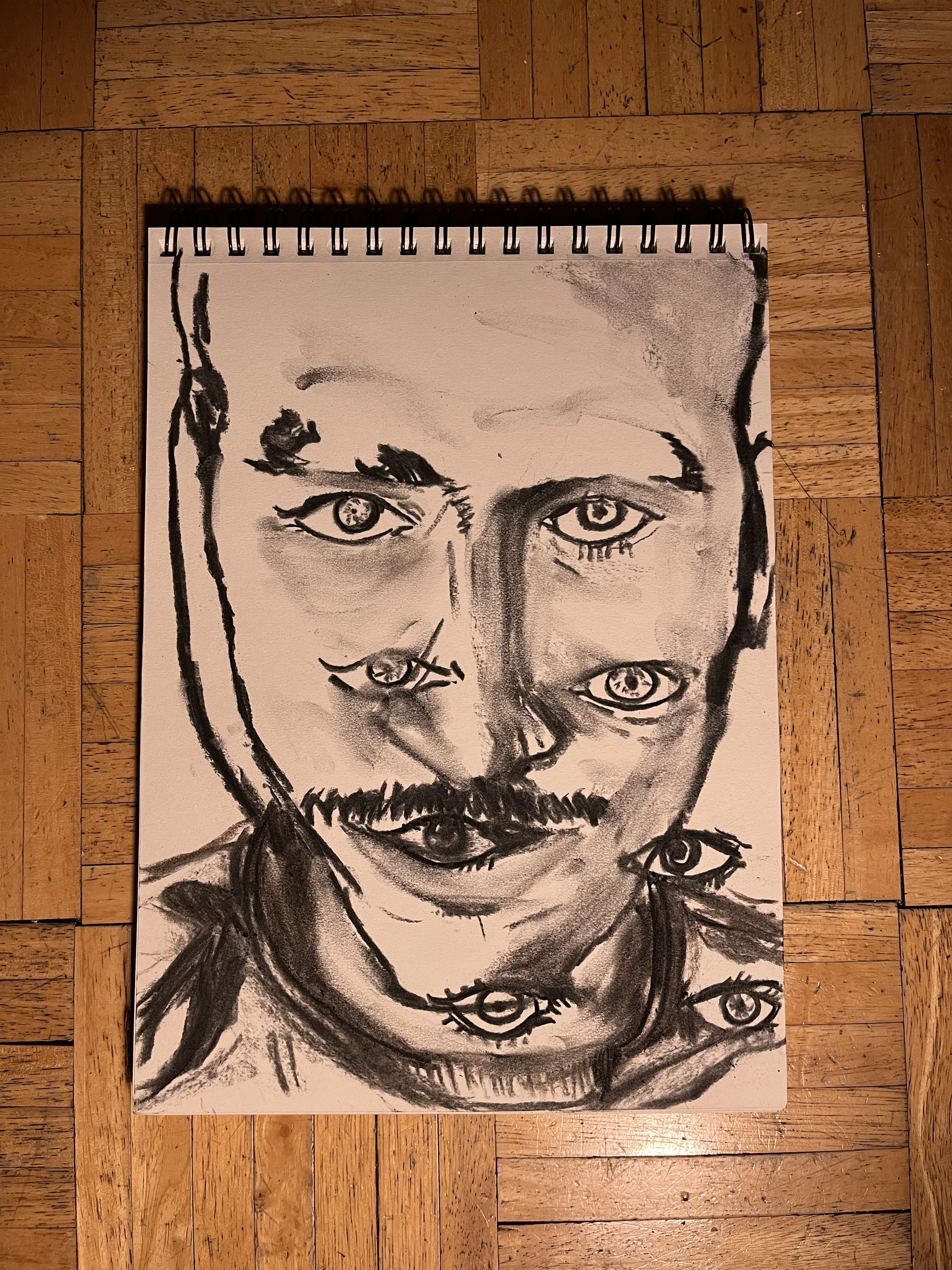 To paint a portrait is to look deeply. I explore myself, other subjects, and society at large through this process. Recently I’ve been making many portraits, some of myself, some invented and some of other individuals. The self portraits are the result of a mindful practice, starting with stillness and coming into contact with self, place and time. As a point of clarification it isn’t that I come into contact with my state and then make a drawing which reflects or illustrates that state; instead I come into contact with my state and then I look in the mirror and draw myself. These portraits provide a trace of the actions I take in time and are an echo of my being. The portrait is a hyperobject, recording not just a likeness but also a state of mind and spirit.